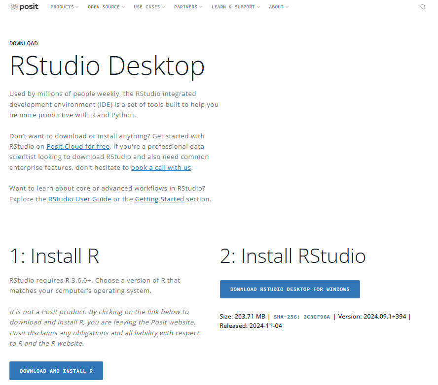 Potrebno je prvo instalirati R na računalo, a potom RStudio. Najbolje je R preuzeti sa službene stranice The Comprehensive R Archive Network. Instalacija RStudija može se provesti na dva načina – preuzimanjem datoteke s Posit-a ili iz R-a (potreban je paket devtools). Prvi je način puno jednostavniji i češće korišten. Nakon preuzimanja instalacijskih datoteka, slijedite upute za instalaciju. Primjer kako postupak instalacije može izgledati dostupan je na GitHubu.