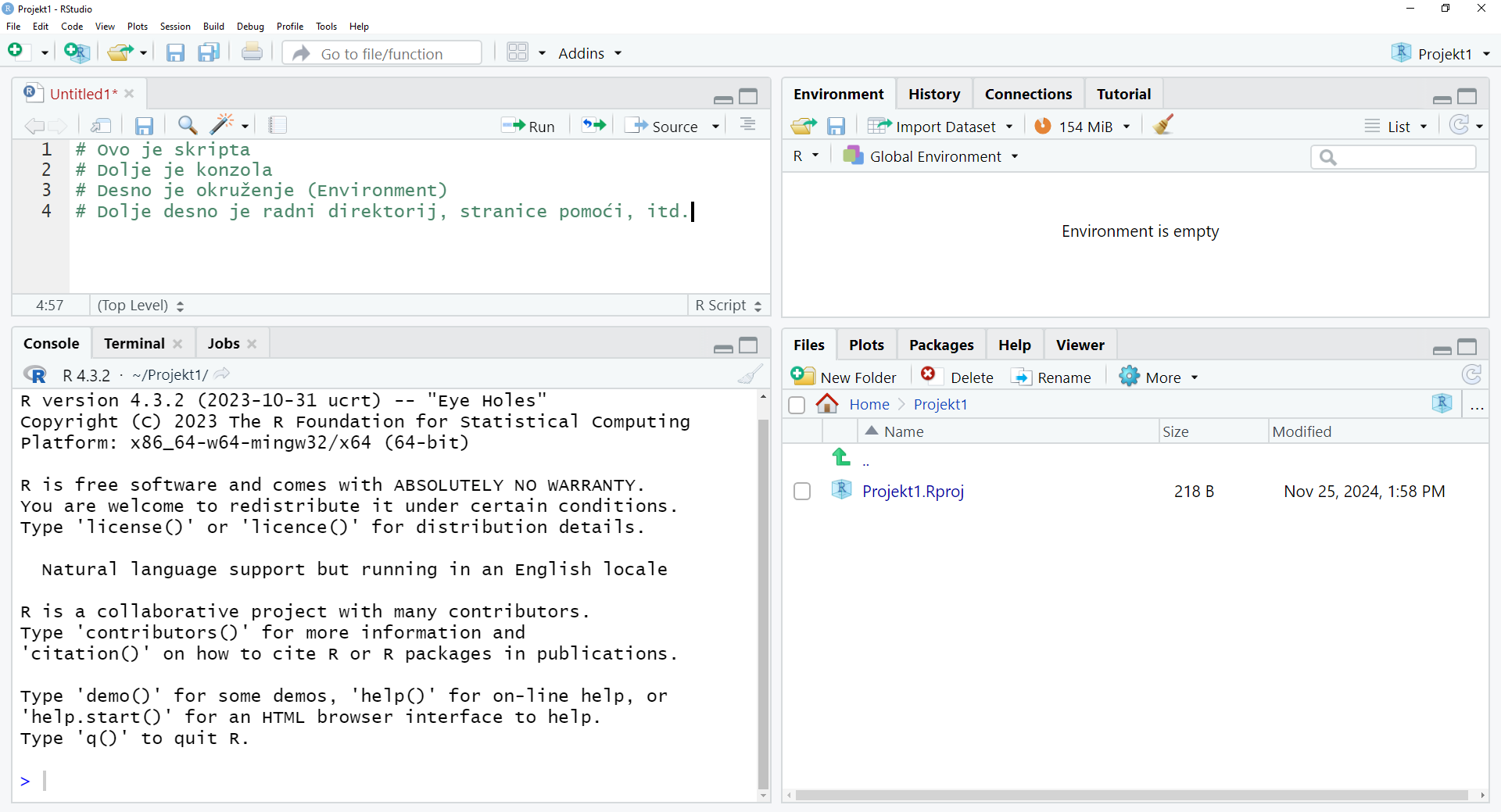 Pri radu u R-u jedan od jednostavnijih pristupa je kreiranje dokumenta R projekta (R project) na početku rada na pojedinom predmetu (File-> New Project->New Directory->New Project te upis naziva novog projekta; alternativno, u gornjem desnom uglu kliknete na dodavanje novog projekta). Na taj način kreira se novo radno okruženje. Ako radite na više predmeta istovremeno i želite svaki od njih sačuvati kako biste se kasnije mogli vratiti radu ili pregledu svakog od njih, korištenje ove opcije će to olakšati. Naime, pojedinom projektu pristupate putem opcije Open project, a ukoliko ste sve pohranili prije posljednjeg zatvaranja, možete nastaviti rad na tom predmetu/projektu, bez da morate počinjati ispočetka svaki sljedeći put. Osim toga, to je korisno i zato jer ćete ponekad htjeti koristiti dijelove koda/ naredbi koje ste kreirali ranije, a ova opcija to olakšava.