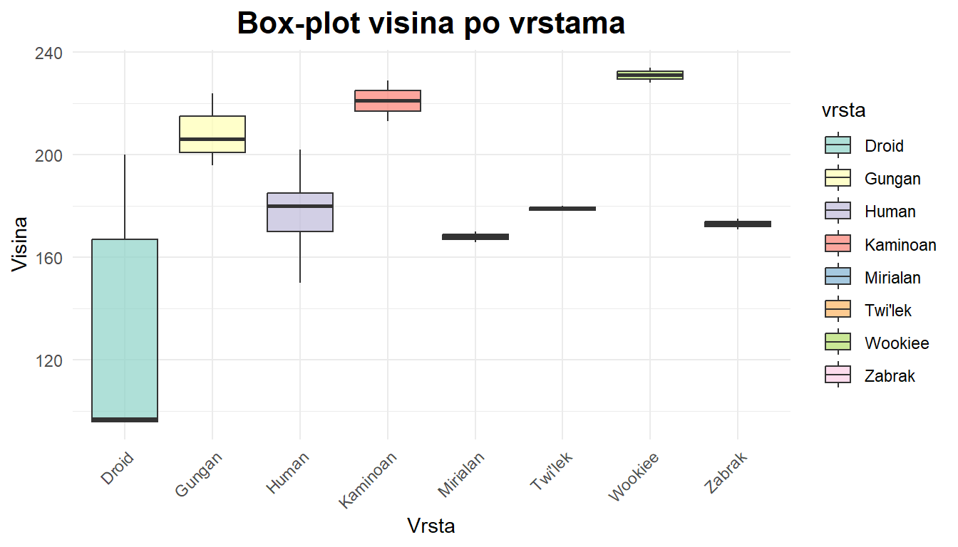Za 6 likova nedostaje podatak o visini, za 28 nedostaje podatak o težini, za 5 nedostaje podatak o boji kose…. Ukratko, is.na(starwars) provjerava je li vrijednost prisutna (FALSE) ili nedostaje (TRUE), dok summary te podatke sažima u zbroj podataka koji su navedeni i onih koji nedostaju.