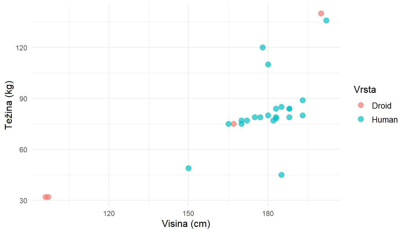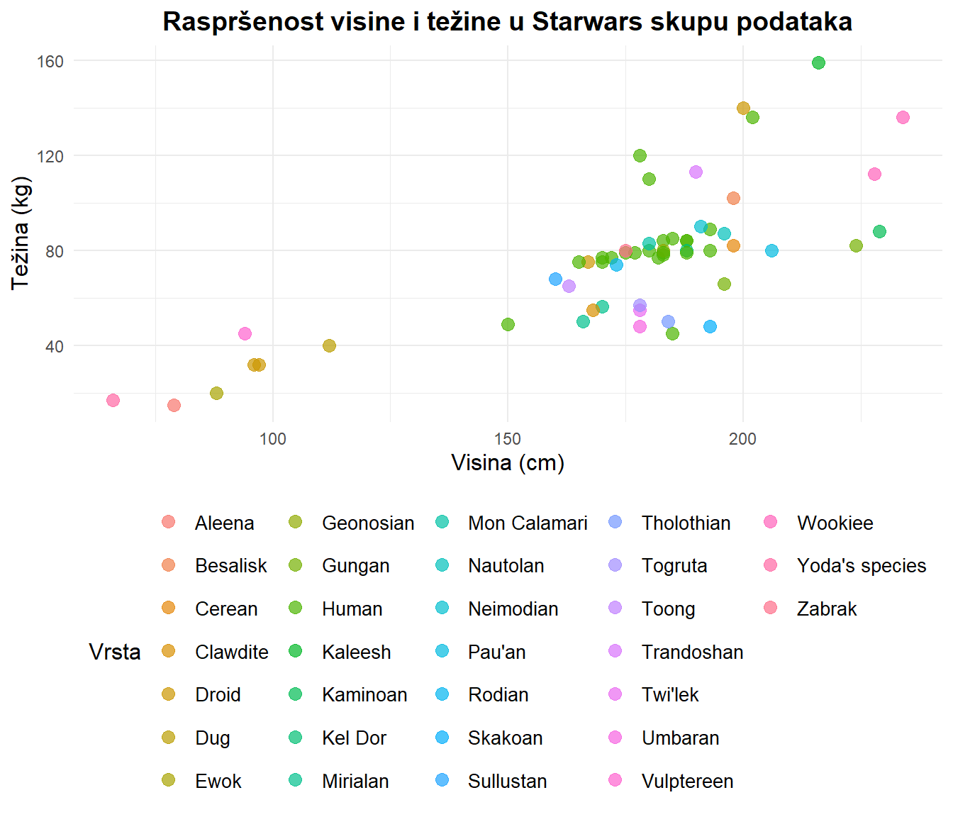 Ovdje će se prikazati osnove upravljanja podacima na datasetu ‘starwars’ iz paketa dplyr (Yarberry and Yarberry 2021). Ovo poglavlje pruža praktičan uvid u primjenu tehnika upravljanja podacima u R-u, koristeći dataset starwars iz paketa dplyr. Kroz primjere se ilustrira kako pristupiti podacima, odabrati i filtrirati relevantne varijable te kako raditi s podacima koji nedostaju. Posebna pažnja posvećena je osnovnim tehnikama čišćenja podataka: zamjena vrijednosti koje nedostaju, formatiranje podataka te pretvaranje višestrukih unosa u jedinstvene zapise. Prikazani su primjeri kako se koristiti složenim tabličnim prikazima, poput tablica kontingencije, dok se dodatnim statističkim izračunima i vizualizacijama analizira raspodjela i povezanost unutar podataka.